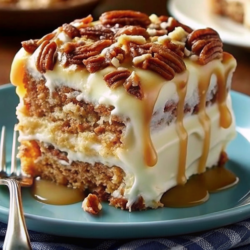 Deep chocolate flavor with hints of cinnamon, a tender crumb, and a gooey, buttery frosting loaded with pecans. The frosting melts into the cake, creating layers of rich sweetness and texture in every bite.