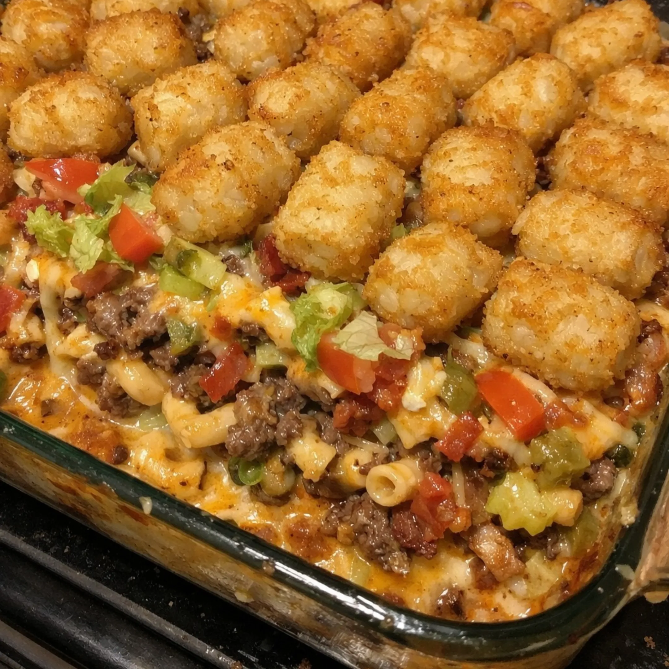 Overview of Loaded Mac Cheeseburger Tater Tot Bomb Bake